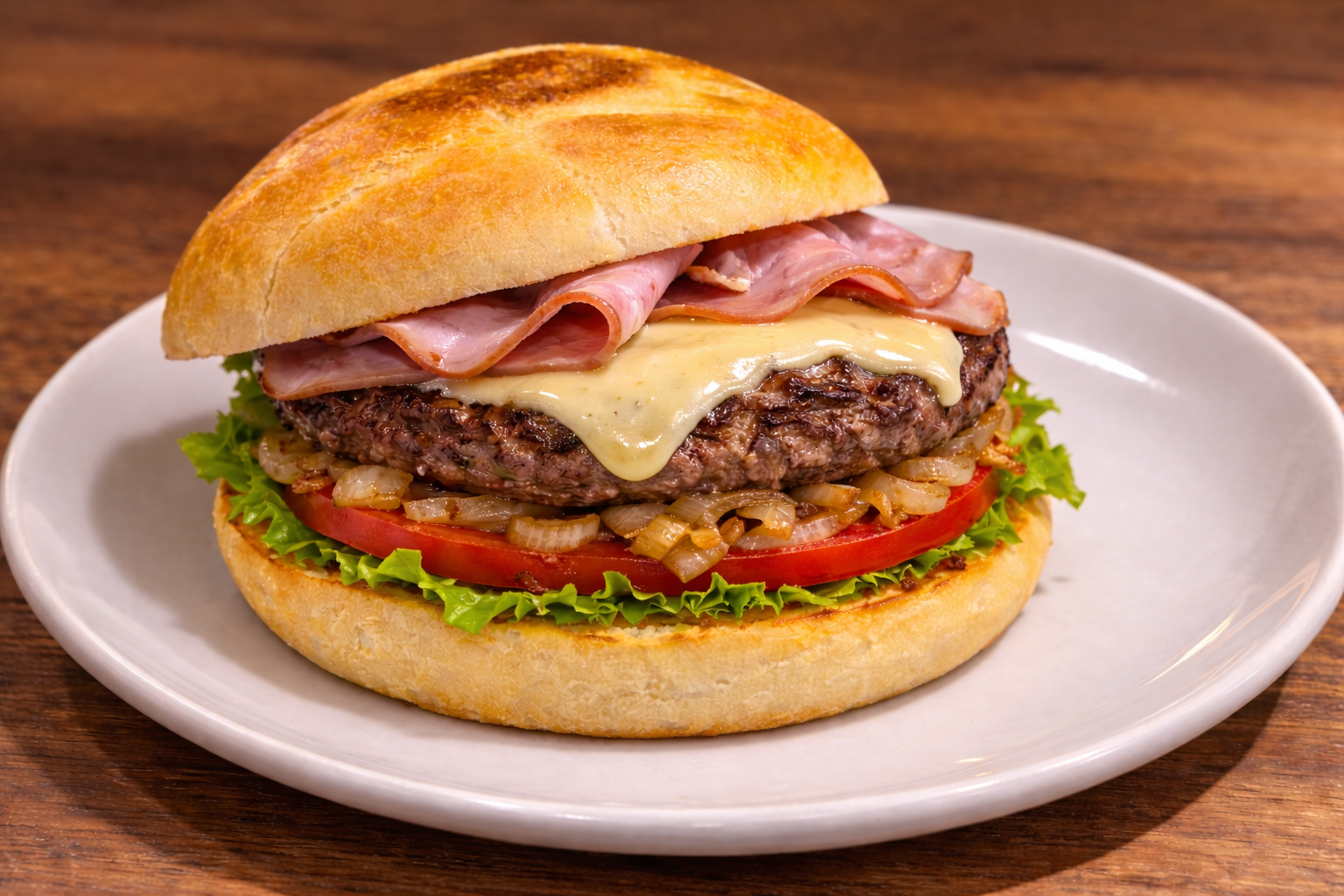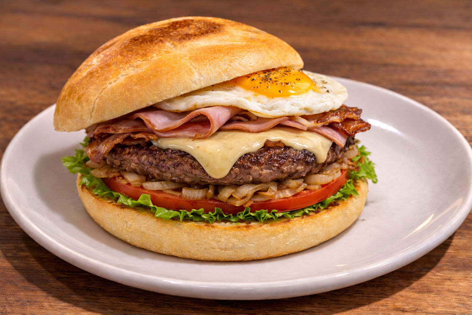 Carne, lechuga, tomate, cebolla, jamón de York, queso, bacón y huevo.