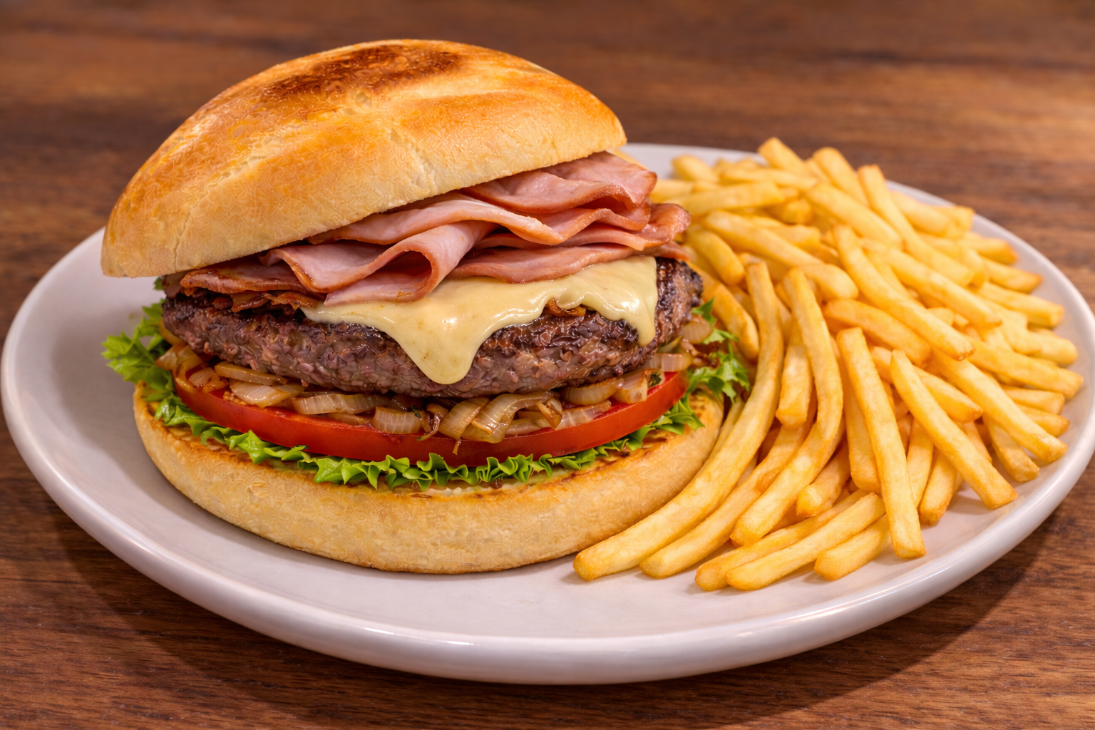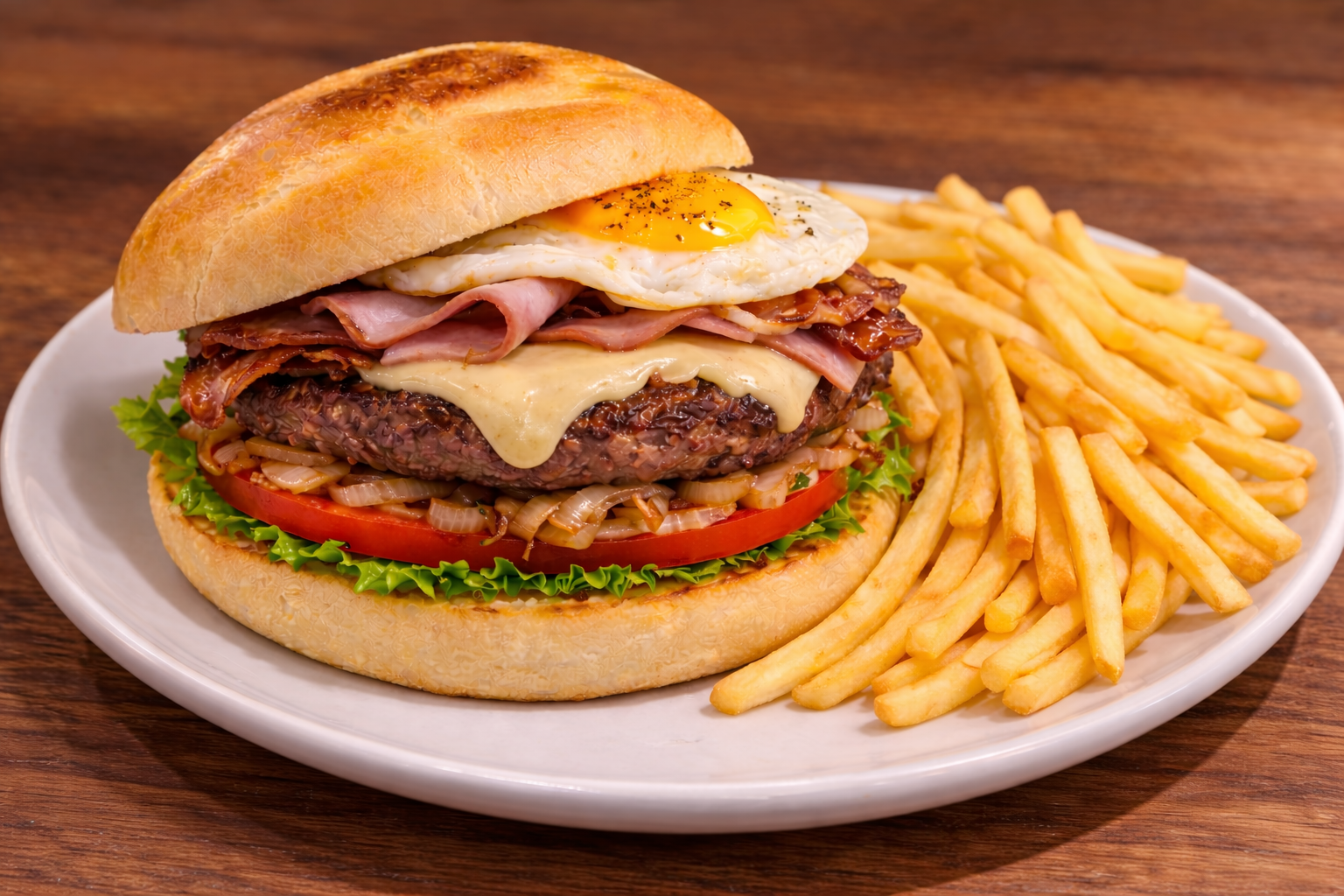 Carne, lechuga, tomate, cebolla, jamón de York, queso, bacón, huevo + patata frita.